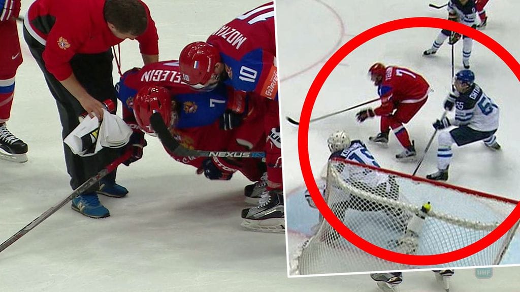 Suomen ja Venäjän välisen jääkiekon MM-välierän päätösminuuteilla nähtiin draamaa, kun Ivan Telegin raahautui tuskaisena jäällä.