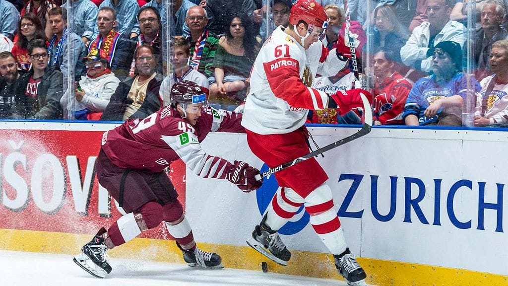 Venäjän puolustaja Nikita Zadorov taklasi rajusti Latvian hyökkääjää Rihards Bukartsia jääkiekon MM-kisoissa Slovakiassa.