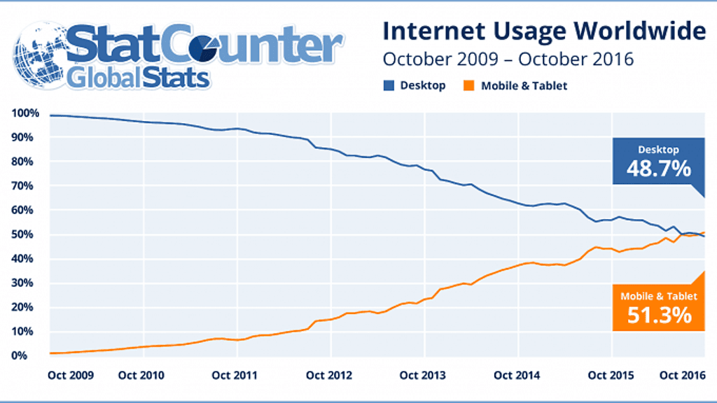 Lokakuussa 2016 mobiililaitteet ja tabletit ovat edustaneet 51,3 prosenttia internetin käytöstä.