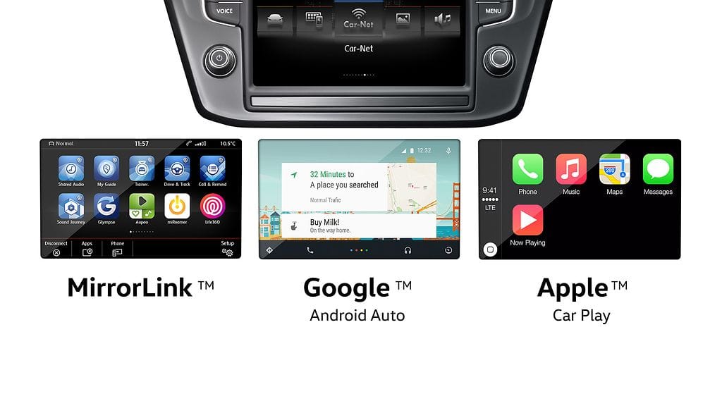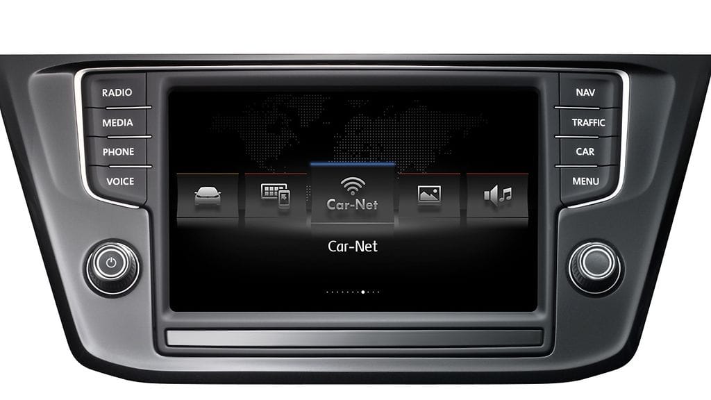 Toimiakseen Car-Net tarvitsee Composition Media tai Discover Media / Discover Pro -navigointijärjestelmän. Siinä Tiguanin kojelaudan keskeltä löytyy iso 8-tuumainen kosketusnäyttö, jonka saa toimimaan monipuolisena viihdekeskuksena.