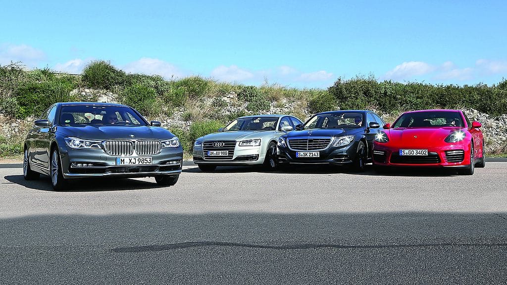 Johtajat, valtionpäämiehet, elokuvatähdet… Saksalaiset ovat hallinneet isoa limusiiniluokkaa, ja lauman johtaja on ollut S-Mercedes. Pystyykö uusi 7-BMW horjuttamaan Mercedestä? Ja pysyvätkö jo hieman ikääntyneet Audi A8 ja Porsche Panamera vielä kyydissä?