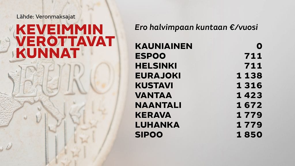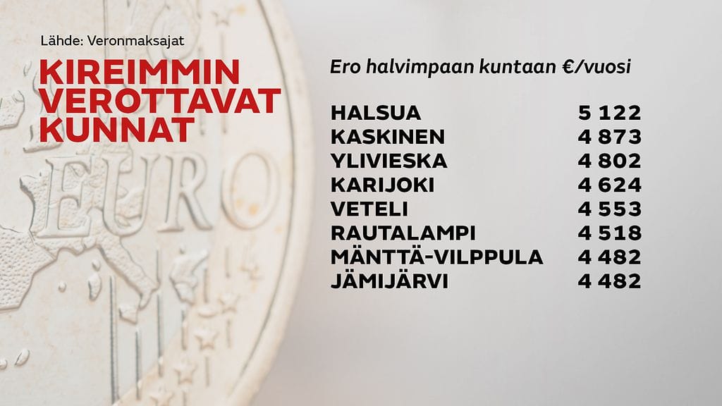 Tänä vuonna Manner-Suomen keveimmin tuloja verottava kunta on Kauniainen ja kirein verottaja Halsua, selviää Veronmaksajain Keskusliiton kuntaverovertailusta. Halsualla tuloveroprosentti on 23,50 ja Kauniaisissa 17,00.