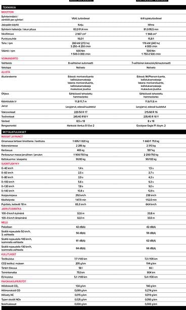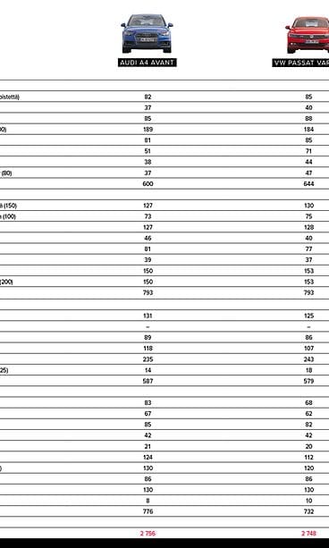 Aika lailla A4:n kokoisen (pituus 4 767 mm, leveys 1 832 mm ja korkeus 1 462 mm) Passatin ohjaamo on laadukkaan oloinen muttei pärjää vertailussa A4:lle. Passatin kabiini on kuitenkin toimivampi kokonaisuus: ergonomia on kohdallaan, ja auton lukuisia avustavia järjestelmiä on helpompi käyttää. Passatin 650-litrainen tavaratila jättää Audin helposti varjoonsa, ja tila venyy vielä 1 780-litraiseksi. Myös takatiloissa Passat vetää selvästi pidemmän korren.