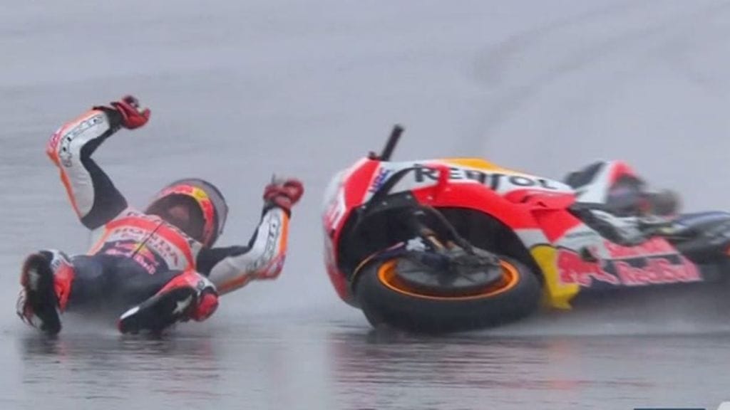 Rossi onnistui nousemaan aina voittokamppailuun asti, kunnes myös hän kaatui märällä radalla. Rossi pystyi ajamaan vielä maaliin asti ja oli lopulta 13.