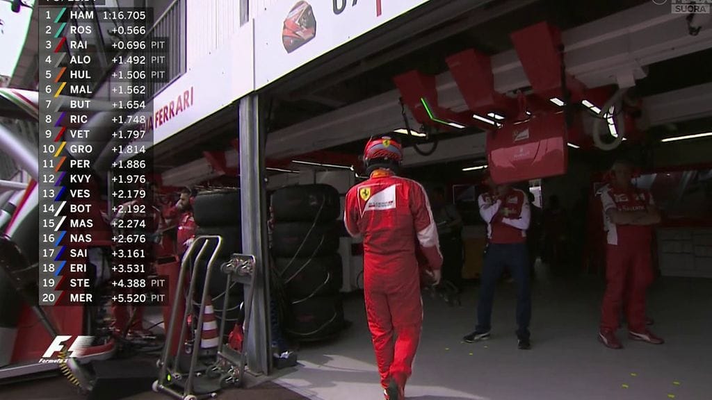 Mercedes viivytti pehmeämmän renkaan vetoaan viimeiselle kymmenminuuttiselle asti. Puoli sekuntia Vettelille hävinnyt Lewis Hamilton totesi lopussa, että huonon pidon lisäksi autossa oli jokin pielessä.