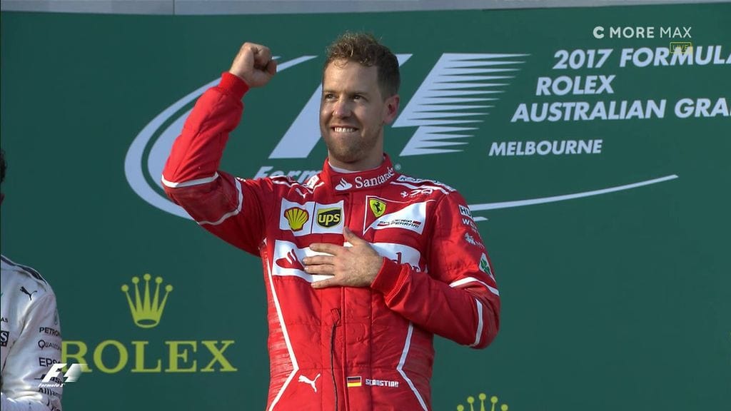 Sebastian Vettel myhäili onnellisena, kun hän juhli voittajana Melbournen F1-kisan päätteeksi.