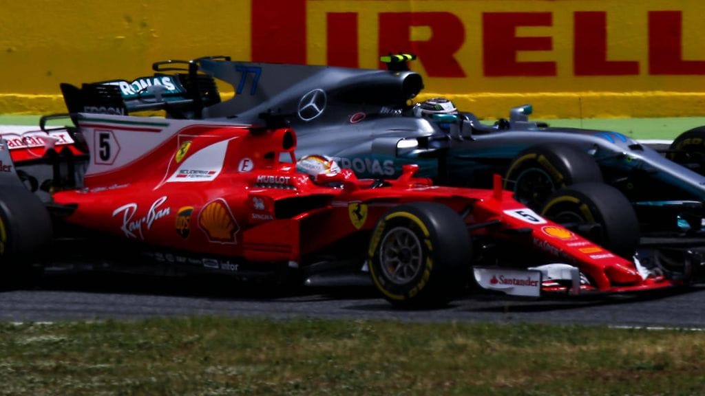 Ferrarin Sebastian Vettel menetti tärkeitä sekunteja Espanjan F1-osakilpailussa, kun hän jäi hetkeksi jumiin Mercedeksen Valtteri Bottaksen taakse.