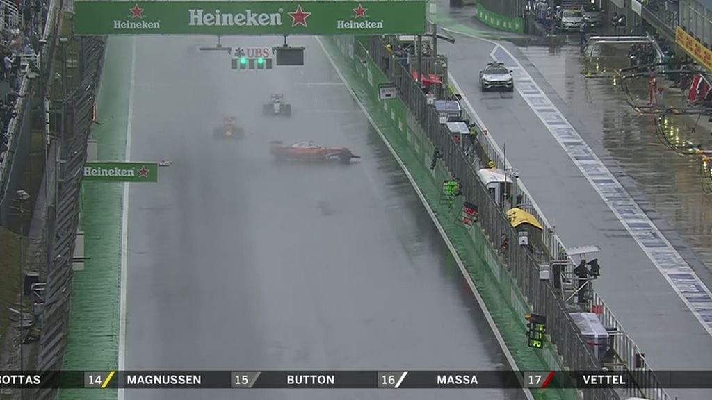 Brasilian F1-kisaa on ajettu todella vaikeissa oloissa, kisa lähti liikkeelle turva-auton perässä, koska rata on niin märkä.