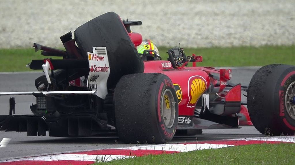 Lauantain aika-ajoissa ilman tulosta teknisen vian takia jäänyt Vettel nousi Malesian GP:ssä takarivistä aina neljänneksi asti, mutta sai vielä jäähdyttelykierroksella voimakkaan osuman Williamsin Lance Strollilta.