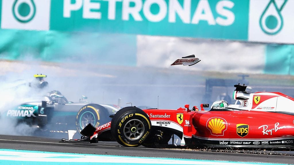 Sebastian Vettelin kisa Malesiassa mureni avausmutkaan. Hän osui sekä Max Verstappeniin että Nico Rosbergiin ja joutui keskeyttämään vaurioidensa takia.