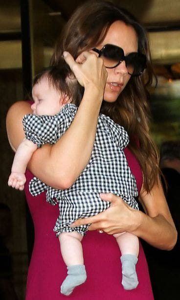 Päällään Victorialla oli elegantti, viininpunainen mekko omasta mallistostaan, sekä jo tavaramerkiksi muodostuneet aurinkolasit ja mahdollisimman korkeat korot. Harper puolestaan oli puettu söpöön ruudulliseen toppiin ja shortseihin.