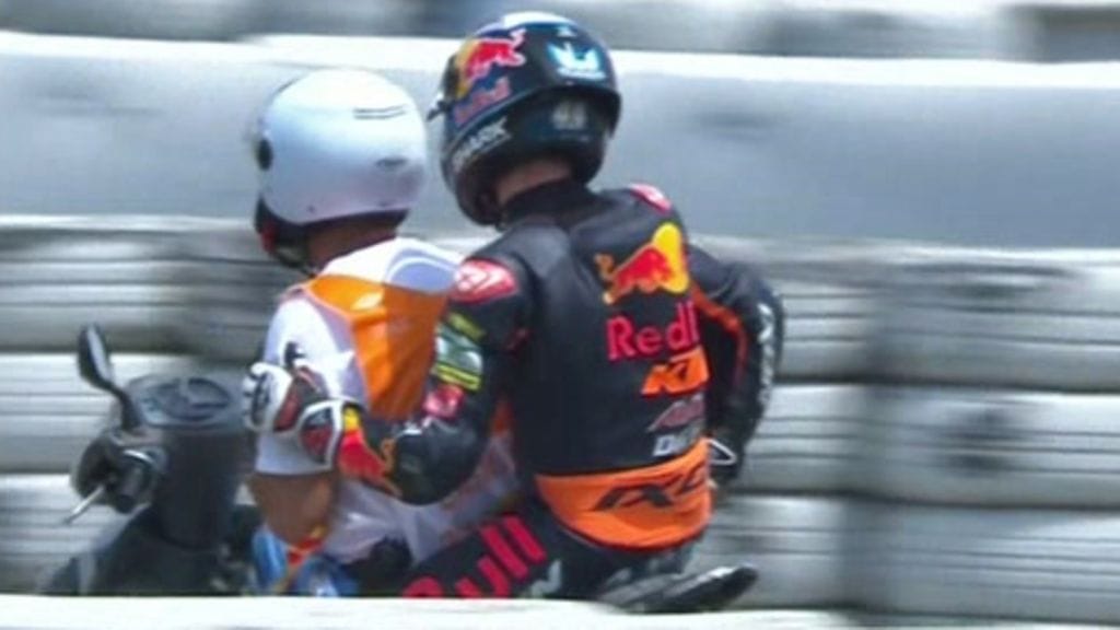 Maaliviivan Fabio Quartararon perässä ylittänyt Oliveira hiljensi pääsuoralla huomattavasti vauhtiaan ja vilkutteli yleisölle. Portugalilaisen ohi syöksyi useita Moto2-pyöriä, kunnes tärähti.