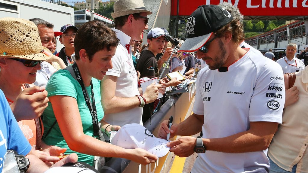 F1.comin kuvaamassa tapaamisessa McLaren-kuski Alonso halusi nähdä tarkemmin, mikä lippu fanilla oli harteillaan. Ja Suomen lippuhan sieltä löytyi.