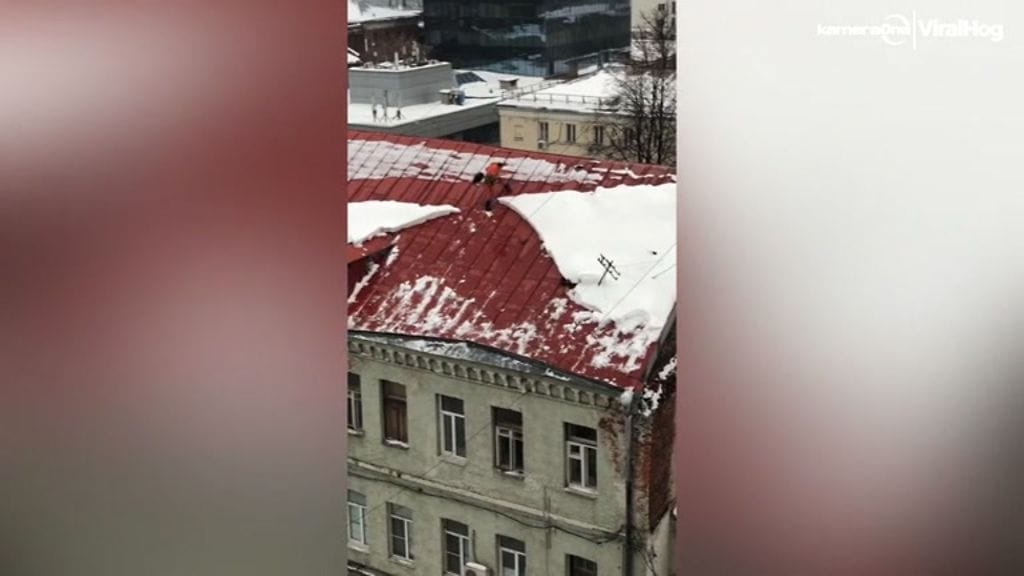 Videolta on nähtävissä, että hyvin pian mies liukastuu ja valuu harjakattoa pitkin alas maahan – kuin varmaan kuolemaan.