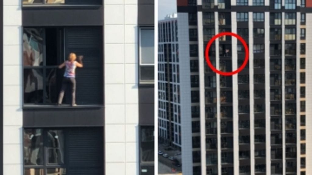Vastapäisessä talossa videon kuvaaja haukkoo henkeään, kun nainen taiteilee parvekkeen ulkopuolella pilvenpiirtäjän 17. kerroksessa, ja kurottelee pelkästään yhden käden ja kapean reunuksen varassa.