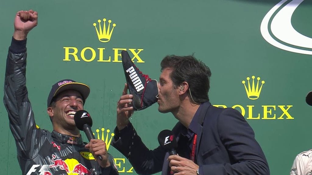 Ricciardo pakotti Webberin vähemmän miellyttävään rituaaliin, kun hän käski aussin ryystämään kuohujuomaa hänen kisakengästään.