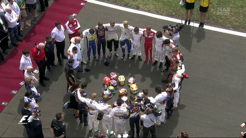 Kaikki nykyiset kisakuljettajat kokoontuivat varttituntia ennen Unkarin GP:n alkua muistamaan edesmennyttä Bianchia. Mukana oli myös Bianchin perhe.