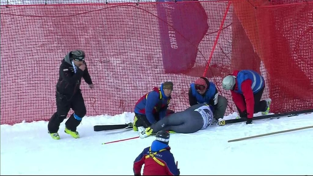 Giraud Moine laski ulos, kun hän menetti tasapainonsa ja syöksyi turvaverkkoihin. Samassa hänen vasen jalkansa näytti napsahtavan poikki polven alapuolelta. Tuskissaan huutanut ranskalainen haettiin kisapaikalta sairaalahoitoon helikopterilla.