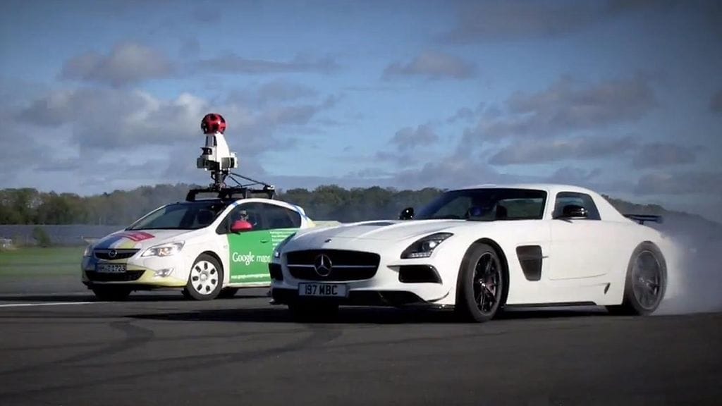 Samalla Google päätti kokeilla, miten sen tavallinen Street View -kuvausauto pärjää Top Gearin hurjapään, The Stigin ohjastamalle Mercedes-Benz SLS AMG -superautolle.