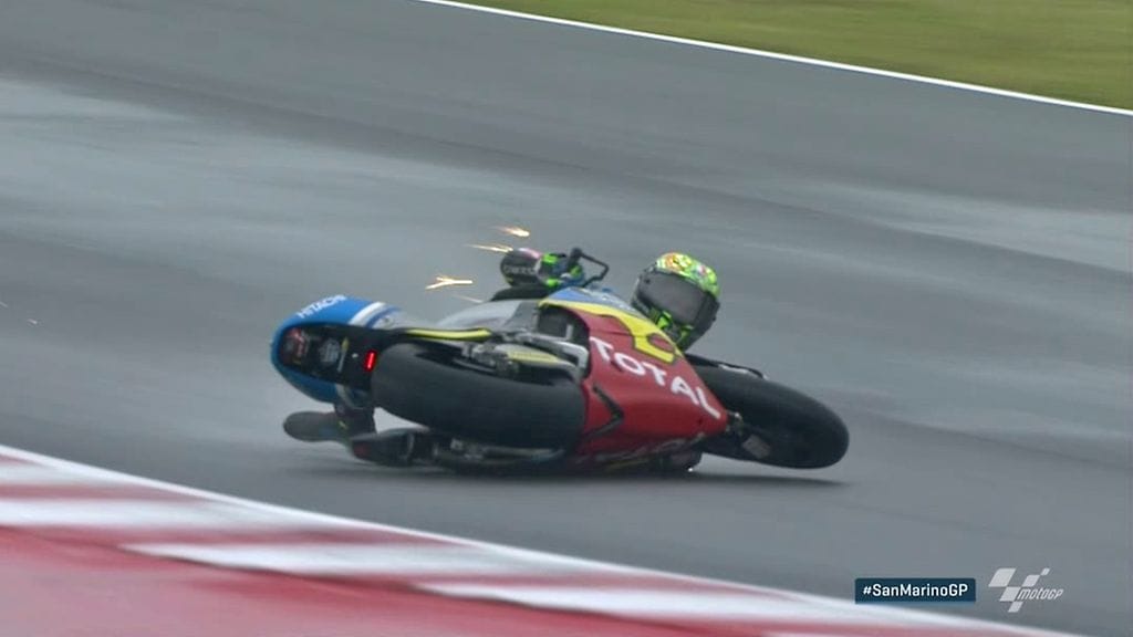 Morbidelli kaatui sateisessa Misanossa heti kilpailun kolmannella kierroksella. Italialaisen pyörä kärsi tärskyssä niin pahat vauriot, ettei kisan jatkaminen ollut enää mahdollista.