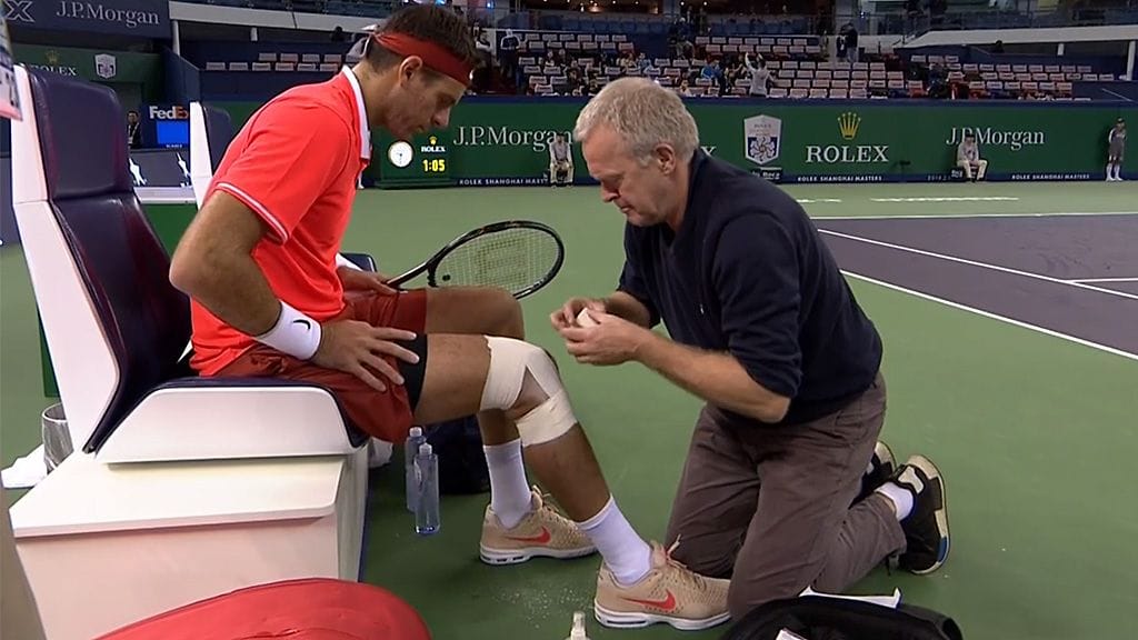 Pääkuvan videolla Del Potron vaikeata liikkumista ja ottelun luovuttaminen.