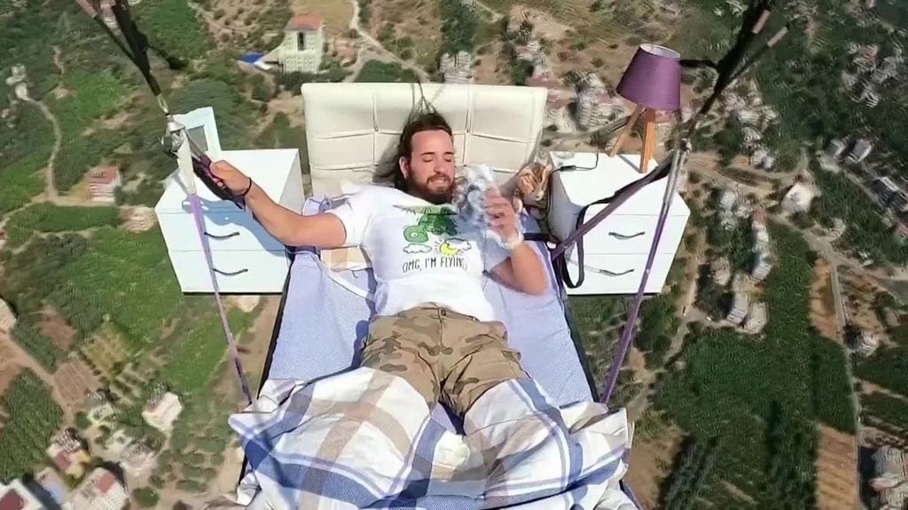 Videolta on myös nähtävissä, kuinka mies laittaa ilmassa kasvoilleen silmälaput ja ottaa sängyssä pienet päiväunet.