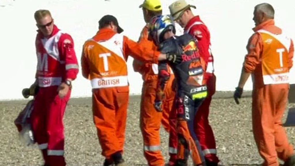 Espanjalainen oli juuri ohittanut ruutulipun 11:ntenä ja hiljensi vauhtiaan, kun yhtäkkiä hän paiskautui kyljelleen ja liukui pitkään asfaltilla. Tärskyn jälkeen Espargaro jäi pyörimään maahan, mutta pystyi lopulta kävelemään radalta pois.