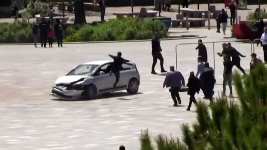 Albanian pääkaupungin Tiranan pääaukiolla huumekuljettajan sekoili vaarallisesti autollaan.