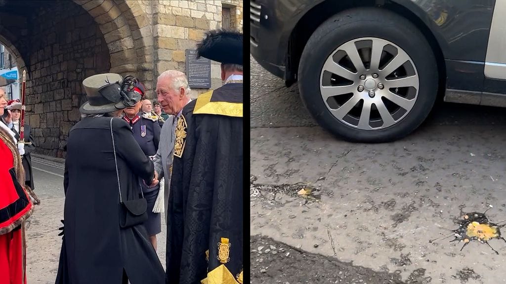 Kuningas Charlesin ja kuningatarpuoliso Camillan vierailu Yorkissa sai ikävän käänteen. Kesken virallisen ohjelman yleisön seassa ollut mies alkoi heitellä hallitsijaa ja Camillaa kananmunilla.