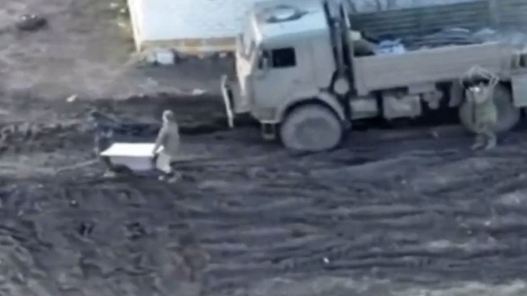 Videolla näkyy kaksi Venäjän sotilasta, jotka kantavat kylpyammetta kuorma-autosta, joka on parkkeerattu jonkinlaisen varastorakennuksen viereen. Kolmas sotilas näyttää kantavan tuolia.