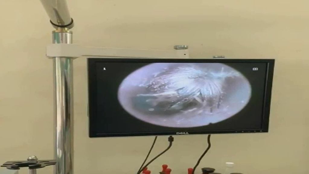 Tähystyksessä kuvatulla videolla näkyy, kuinka lääkäri poistaa toukkaa pihtien avulla. Toukan vierailusta ei aiheutunut pysyvää haittaa miehen korvaan. Voit katsoa videon jutun alusta.