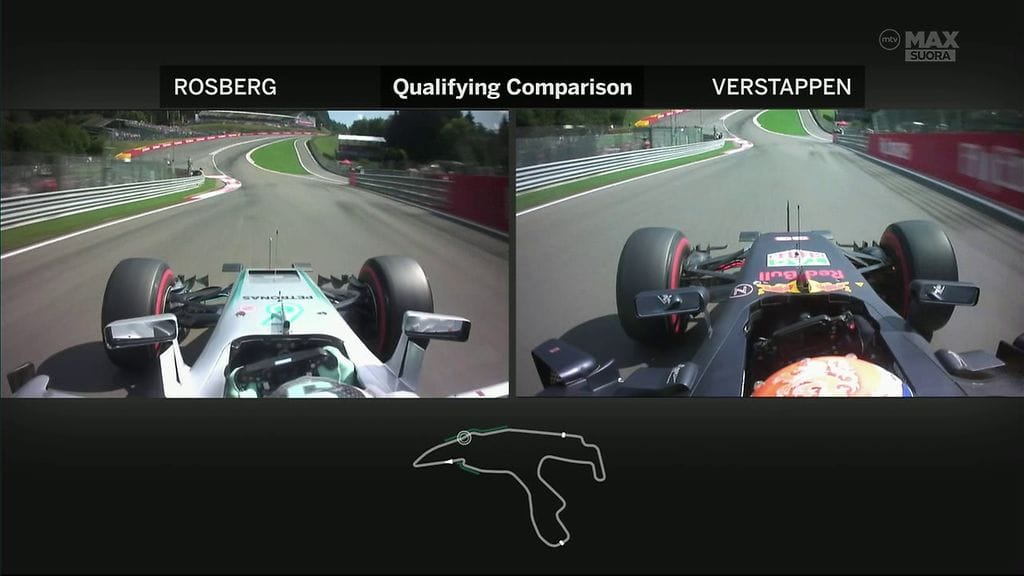 MTV Sportin F1-asiantuntija Mika Salo näyttää videon avulla, miten paalupaikan Spassa saavuttanut Nico Rosberg hyötyy tietyissä kohdissa Mercedeksen moottoritehoista huomattavasti ketterämpää Max Verstappenin Red Bullia vastaan. Toisaalta Verstappen pääsi välillä livahtamaan johtoon.