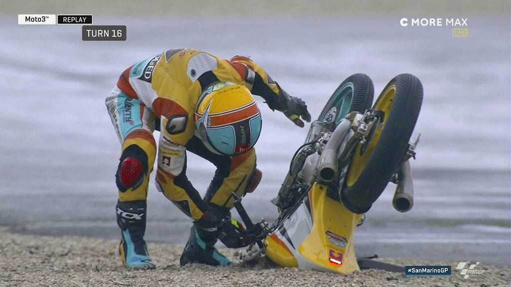 San Marinon Moto3-luokan osakilpailuun startattiin vesisateessa, mikä näkyi heti lukuisina ulosajoina.