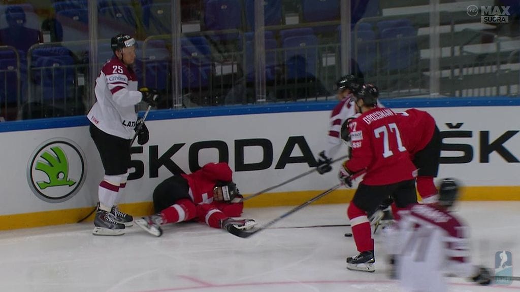 Latvian Andris Dzernis taklasi törkeästi selkäpuolelta Sveitsin Noah Schneebergeriä heti ensimmäisellä minuutilla. Rajusti päin laitaa törmännyt Schneeberger nousi nopeasti pystyyn, mutta poistui vaihtoaitioon niskaansa pidellen.