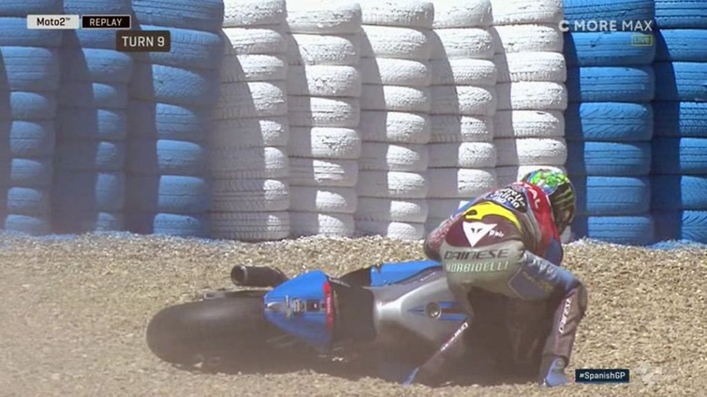 Toisesta lähtöruudusta startannut Kalex-kuski oli ehtinyt nousta kisan piikkipaikalle ennen kaatumistaan. Morbidelli työnsi pyöränsä vielä radalle, mutta ajoi suoraan varikkopilttuuseen.