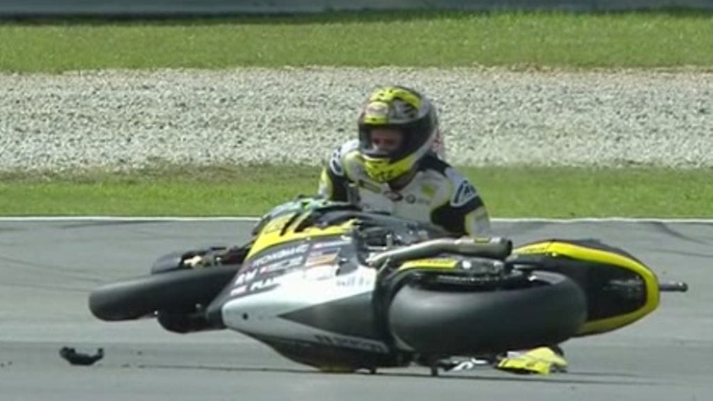 Moto2-luokan mestaruudesta taisteleva Thomas Lüthi kaatui todella pahannäköisesti Malesian aika-ajoissa.