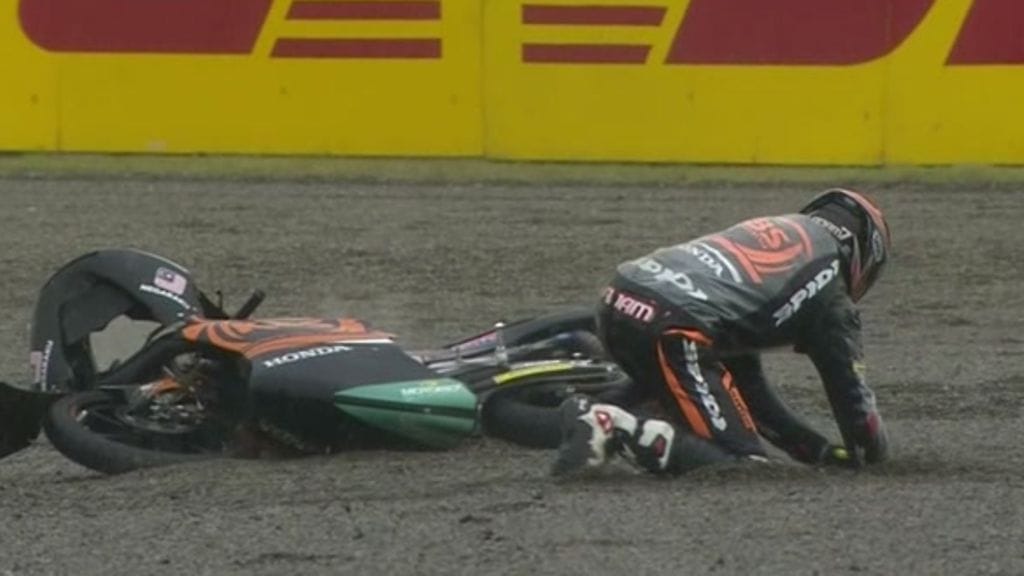 Moto3-luokan ainoa malesialaiskuljettaja Adam Norodin rysäytti todella pahannäköisesti ulos Japanin osakilpailussa.