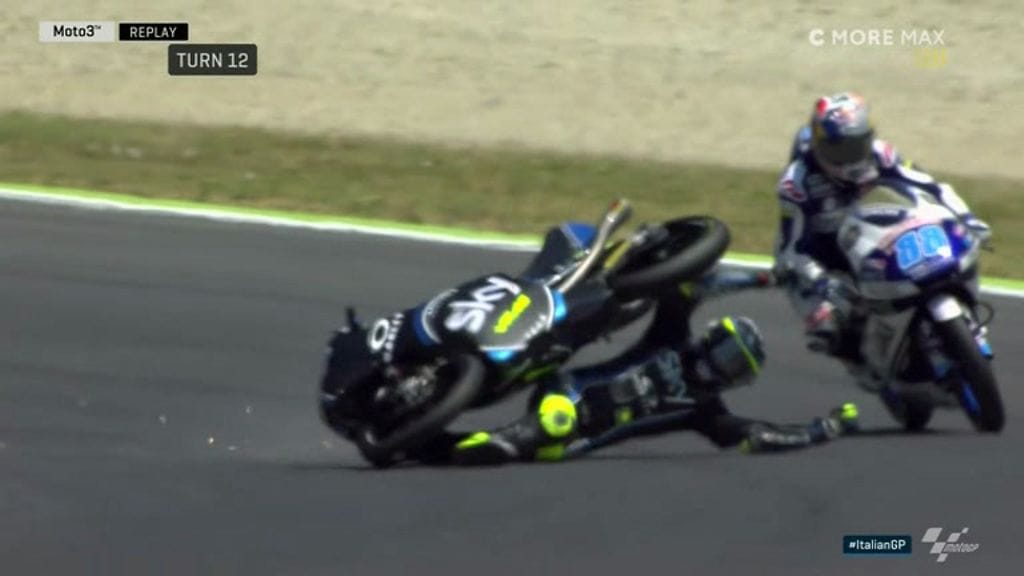 Moto3-luokan Mugellon aika-ajoissa nähtiin heti ensi minuuteilla kaksi hurjaa kaatumista.