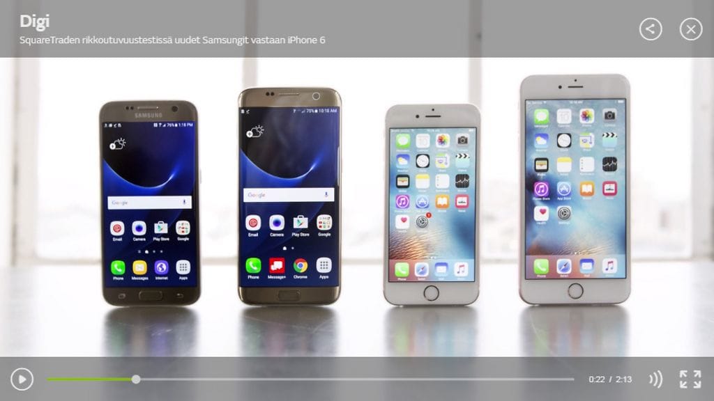 Video osoittaa, miten testimallien käy, kun ne pudotetaan kahden metrin korkeudesta tai upotetaan veteen puoleksi tunniksi. Testissä olivat mukana Samsungin uutuusmallit S7 ja S7 Edge sekä vertailun vuoksi kilpailijan Applen iPhone 6s.