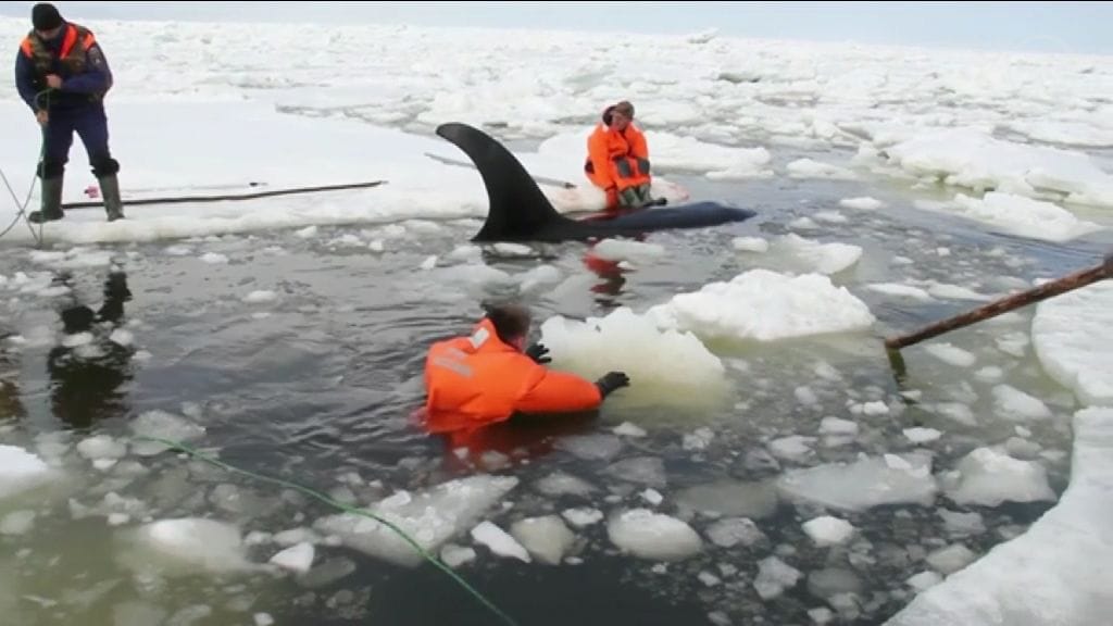 Venäjällä pelastusviranomaiset ovat auttaneet miekkavalaita irti jäistä.