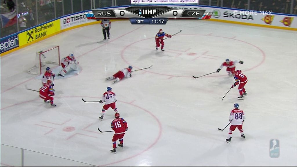 Ottelu on avauserän jälkeen 2-0 tilanteessa. Venäjän NHL-tähdet Nikita Kutserov ja Jevgeni Kuznetsov värkkäsivät toisen maalin.
