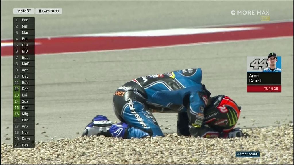 Uusintastartin jälkeen seuraava säikäyttäjä oli paalulta lähtenyt Aron Canet, joka kaatui hurjannäköisesti kärkipaikalta. Myös hän selvisi ilmalennosta säikähdyksellä.