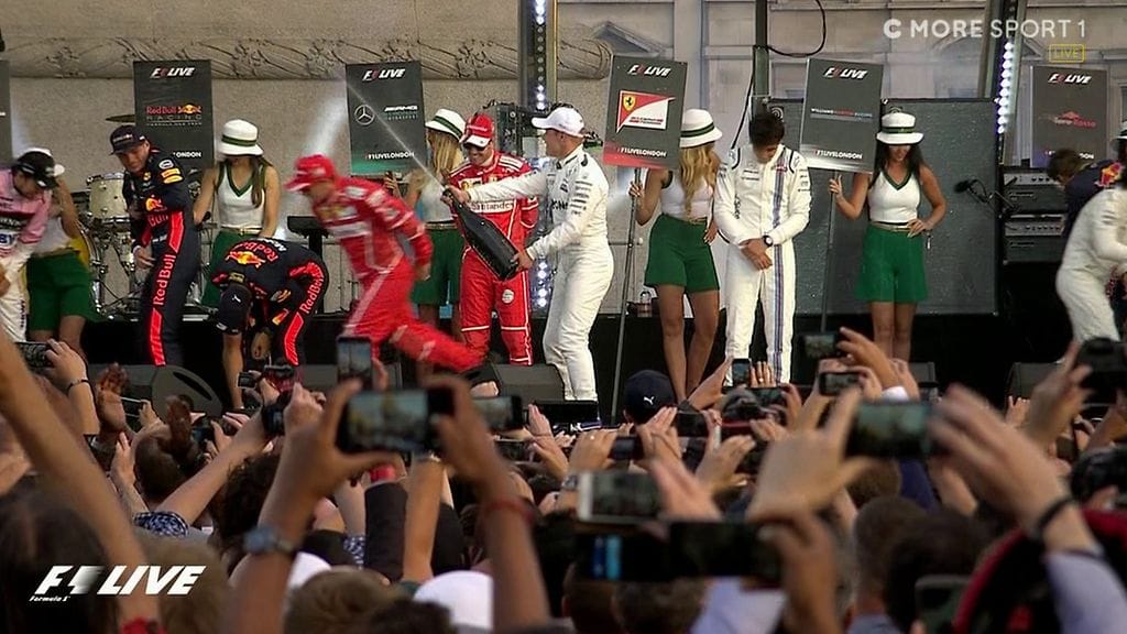 Tapahtuman päätteeksi kaikki kuljettajat kokoontuivat Trafalgar Squaren lavalle nauttimaan yleisön suosionosoituksista. Viimeisenä lavalle asteli Mercedes-tähti Bottas samppanjapullo mukanaan.