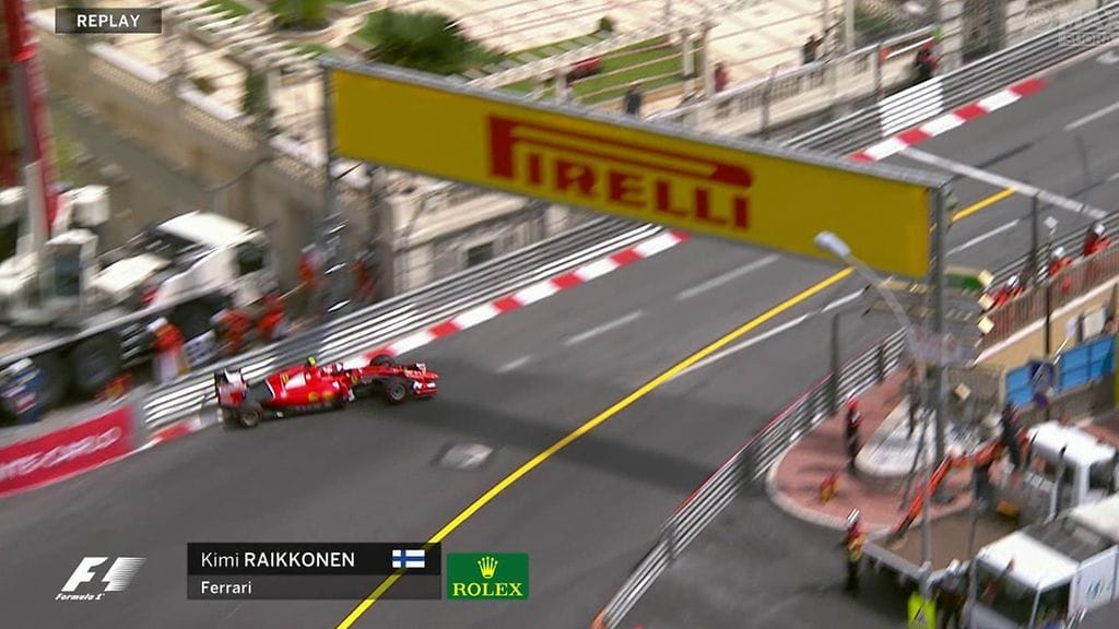 Kimi Räikkösen takarenkaan puhkeaminen keskeytti formula ykkösten kolmannet harjoitukset Monacossa.