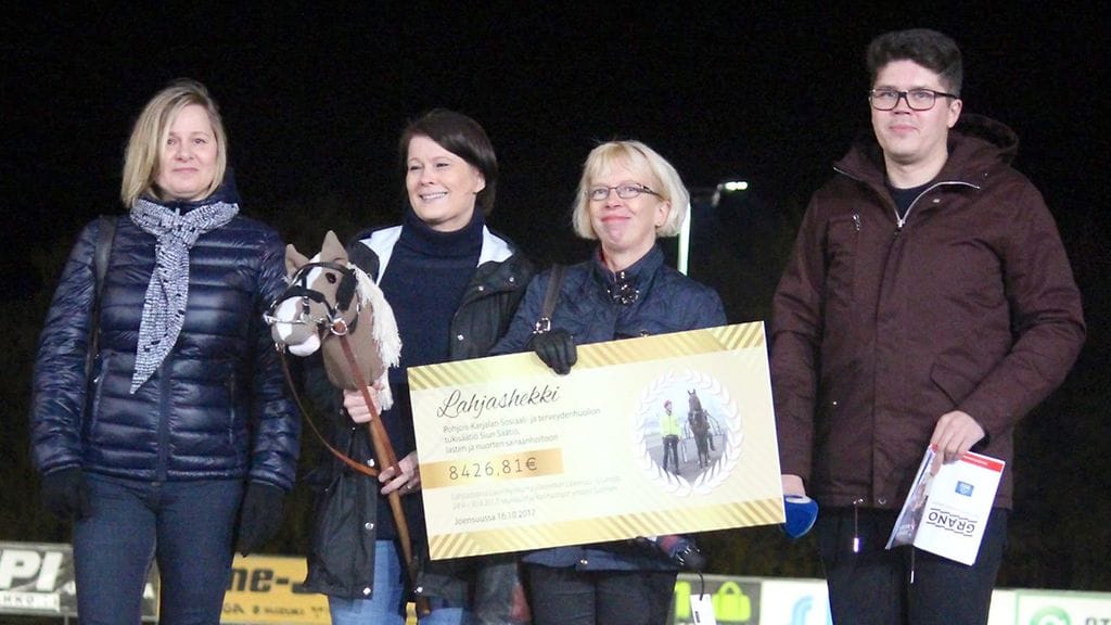 Ravikansan suosikkiselostaja Lauri Hyvönen luovutti kotiratansa Joensuun Toto4-raveissa hävityn vedon poikiman hyväntekeväisyystempauksen tuoton Pohjois-Karjalan keskussairaalaan lastenosastolle.