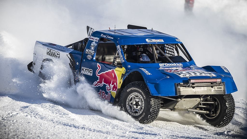 Frozen Rush -kilpailussa olevat autot ovat 900-hevosvoimaisia avolavoja, jotka ovat varustettu liukkaalle pinnalle sopivilla piikkirenkailla. Muiden vauhtilajien tapaan myös tämä autojen kaksinkamppailu tarjoaa vauhdikasta viihdettä ja vaarallisia tilanteita. Seuraavan kerran tehohirmujen kisailua on luvassa 8. päivä tammikuuta ja kilpailua voi seurata suorana osoitteessa Red Bull TV:stä.