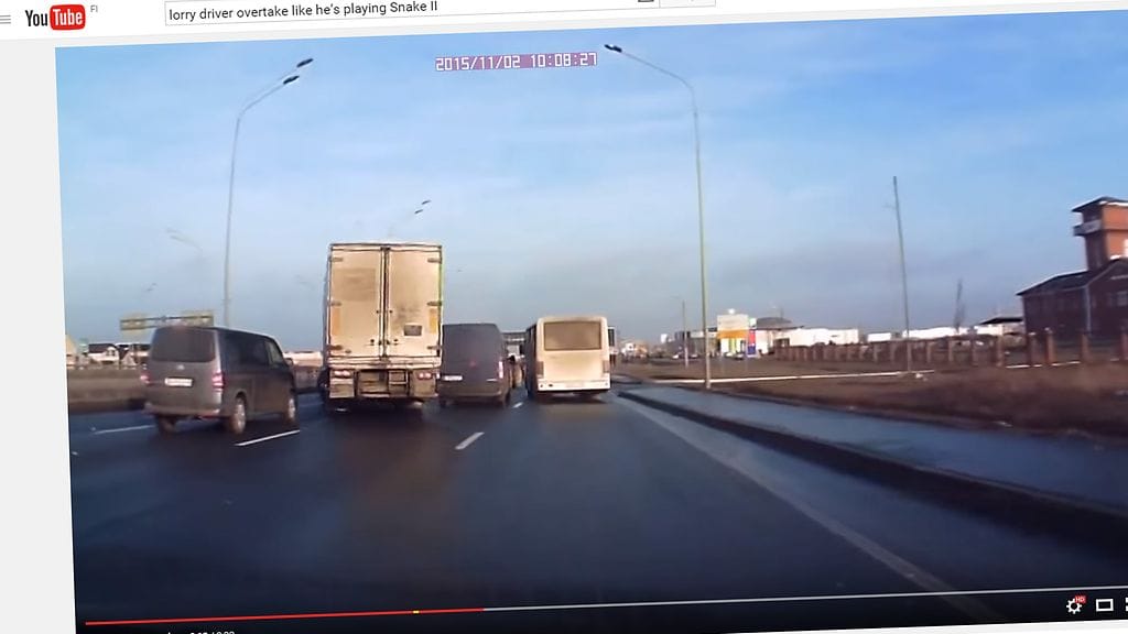 YouTubesta bongatulla videolla nähdään vaaratilanne, joka syntyy kun varomaton pakettiauton kuljettaja jarruttaa ja tekee äkkipysähdyksen väistäessään bussia.