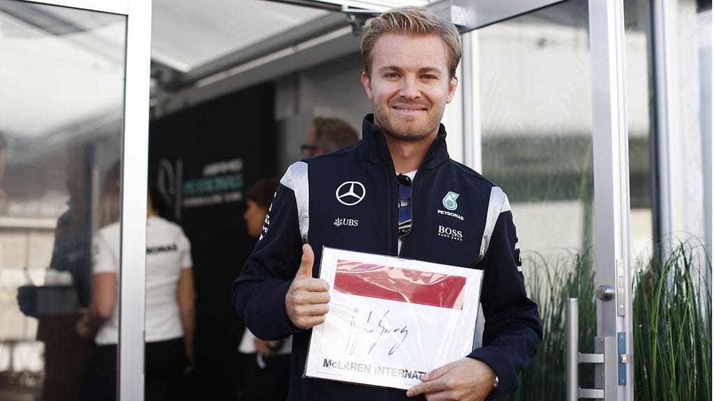 – Hienoin juttu, tässä se on, Rosberg sanoi ja otti esiin ison kortin, jossa komeili Ayrton Sennan nimikirjoitus.