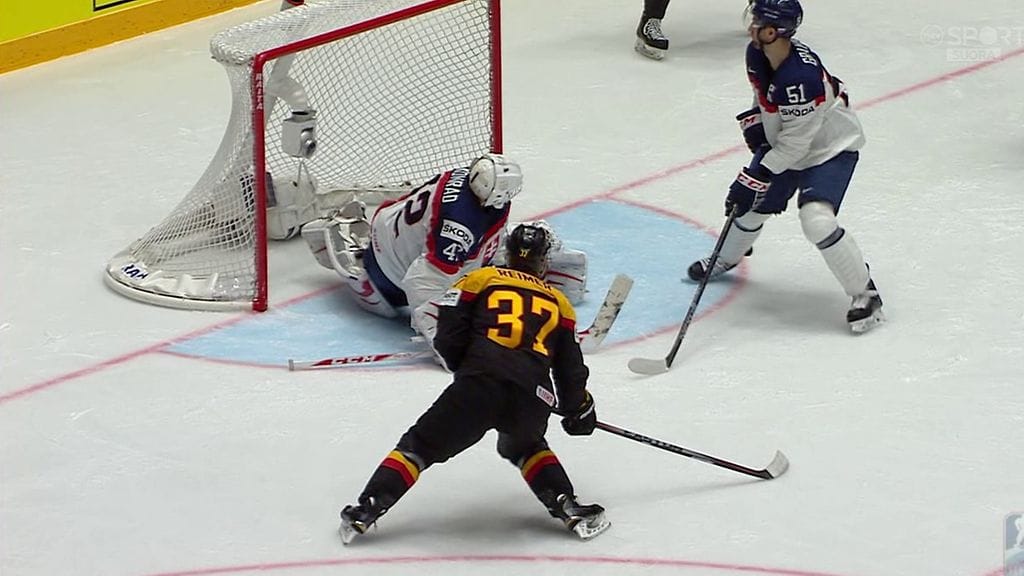 Philip Gogulla tälläsi siniviivan tuntumasta Saksan 2-1-johtomaalin. Hetkeä myöhemmin Saksa hyödynsi ylivoimansa, kun DEL-liigan maalitykki Patrick Reimer ohitti slovakialaisvahti Branislav Konradin kolmannen kerran.