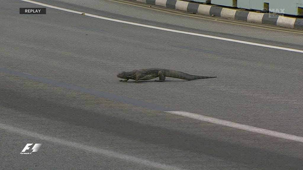 Singaporen GP:n lauantaisissa F1-harjoituksissa nähtiin erikoinen tilanne, kun kookas lisko käveli Marina Bayn katuradan poikki kesken ajosession.